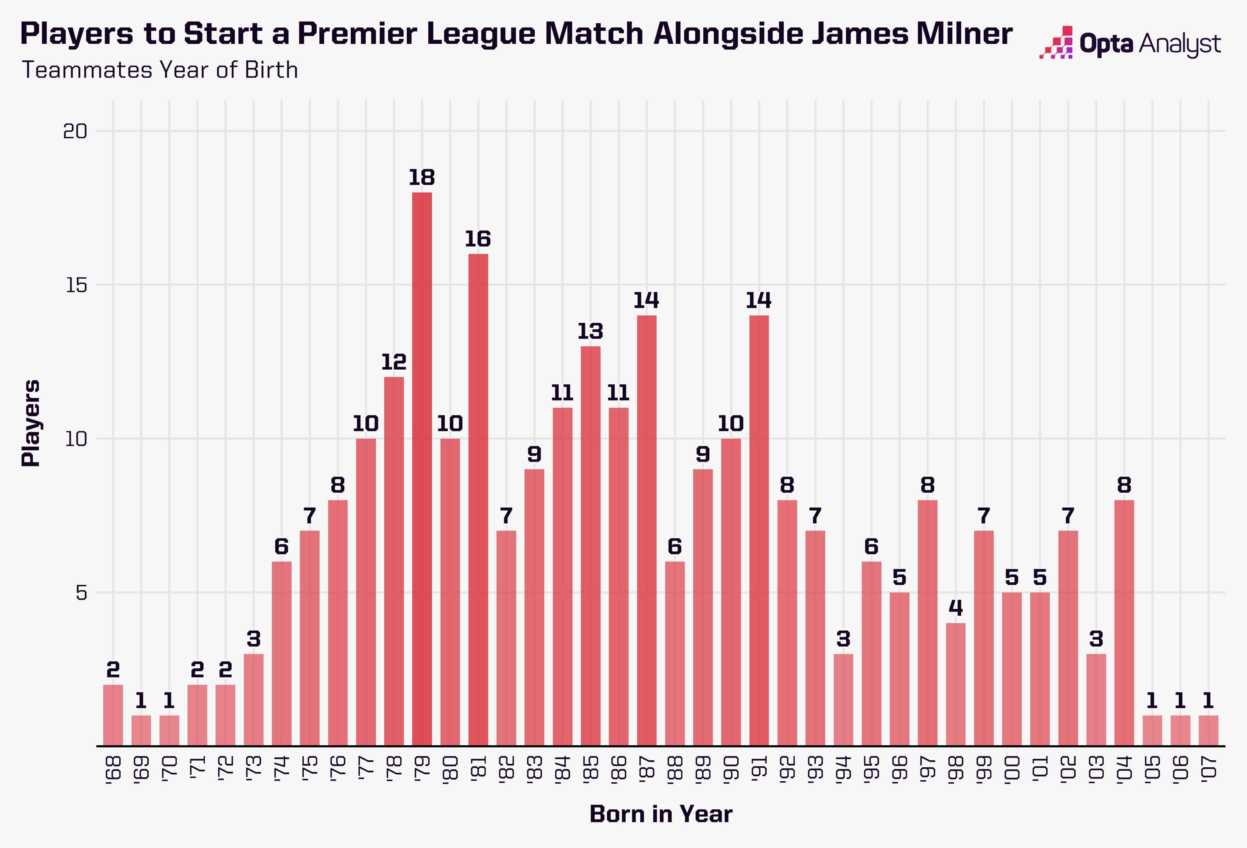米尔纳在英超联赛中拥有281名不同的队友,曾与出生于1968年至2007年每年的球员并肩作战。